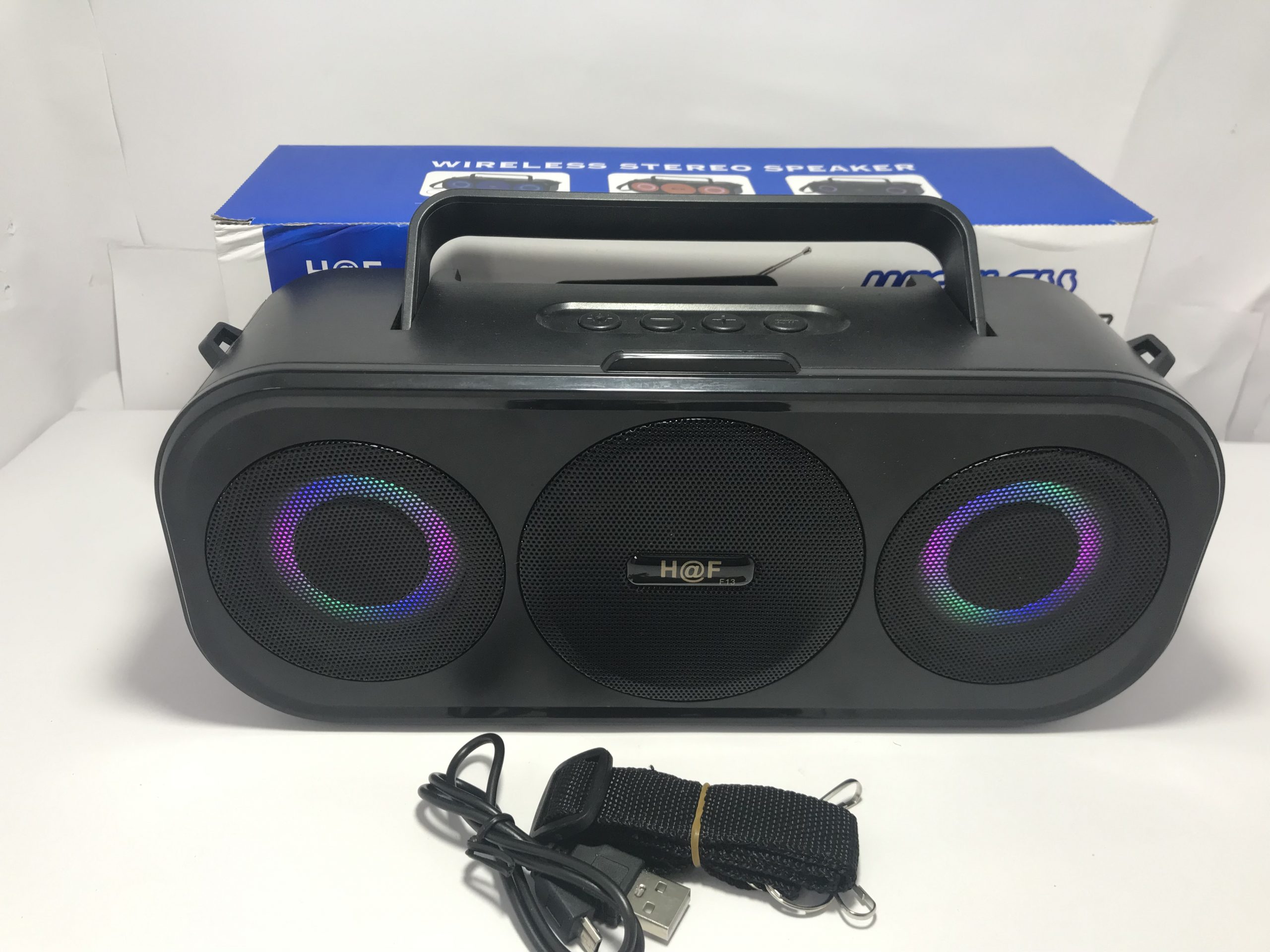 El Parlante Bluetooth H@F HF-F13 es la combinación perfecta de potencia y diseño, ideal para llevar tu música a cualquier lugar. Con su sonido HiFi, luces LED y múltiples opciones de conectividad, disfrutarás de una experiencia musical envolvente en fiestas, reuniones o momentos de relajación.