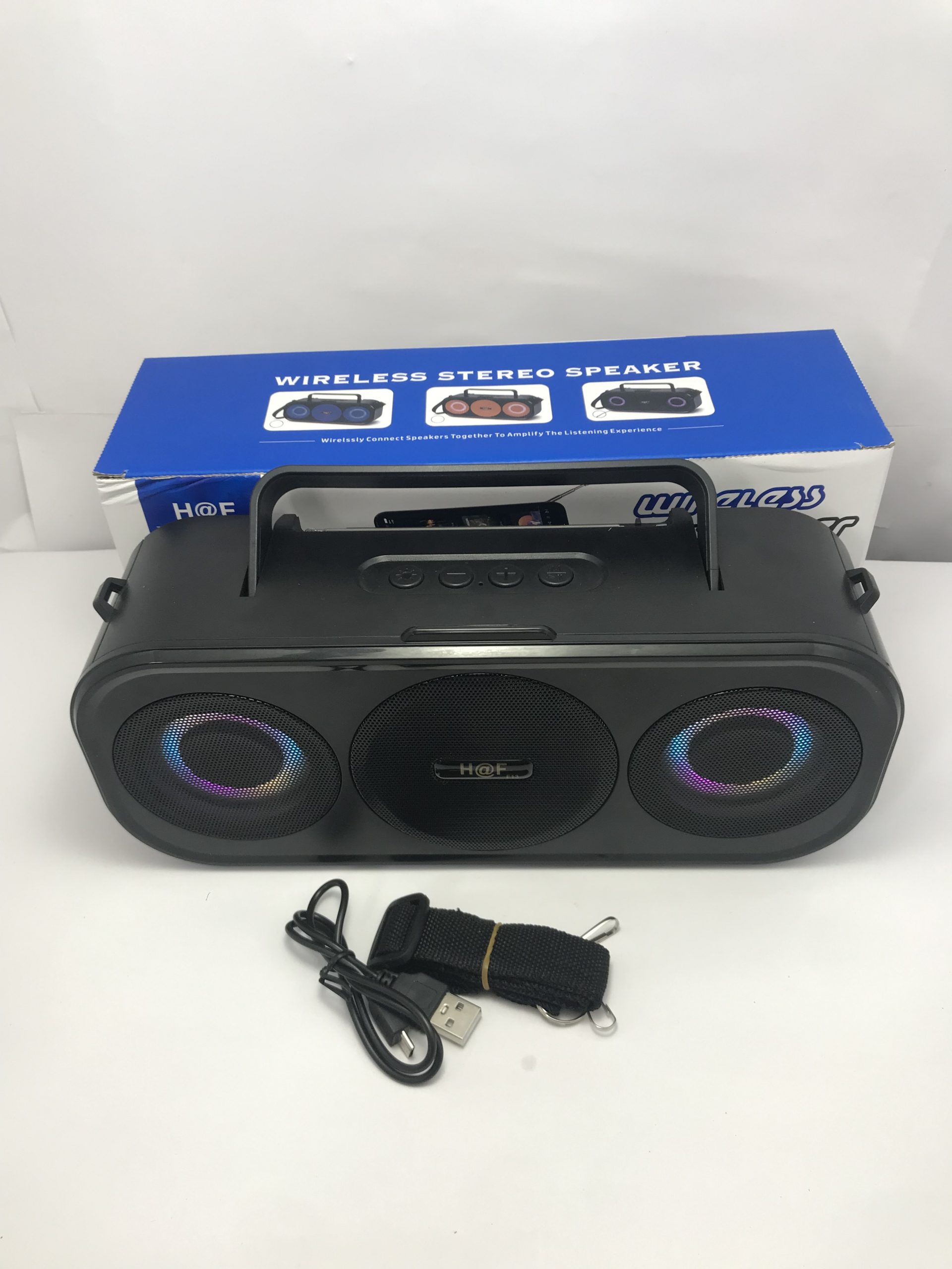 El Parlante Bluetooth H@F HF-F13 es tu compañero ideal para cualquier ocasión. Su sistema de sonido HiFi ofrece una calidad envolvente, mientras que las luces LED crean un ambiente perfecto para tus fiestas. Además, su correa de transporte lo hace fácil de llevar a cualquier lugar.